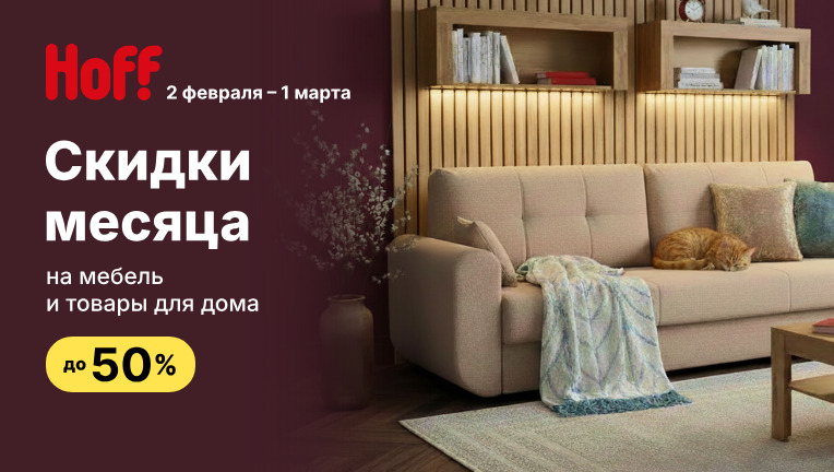 С 2 февраля по 1 марта дарим настроение обновления! В Hoff стартуют Скидки месяца на мебель и товары для дома. Успейте найти свой идеальный диван, уютный текстиль или практичный шкаф со скидкой до 50%.